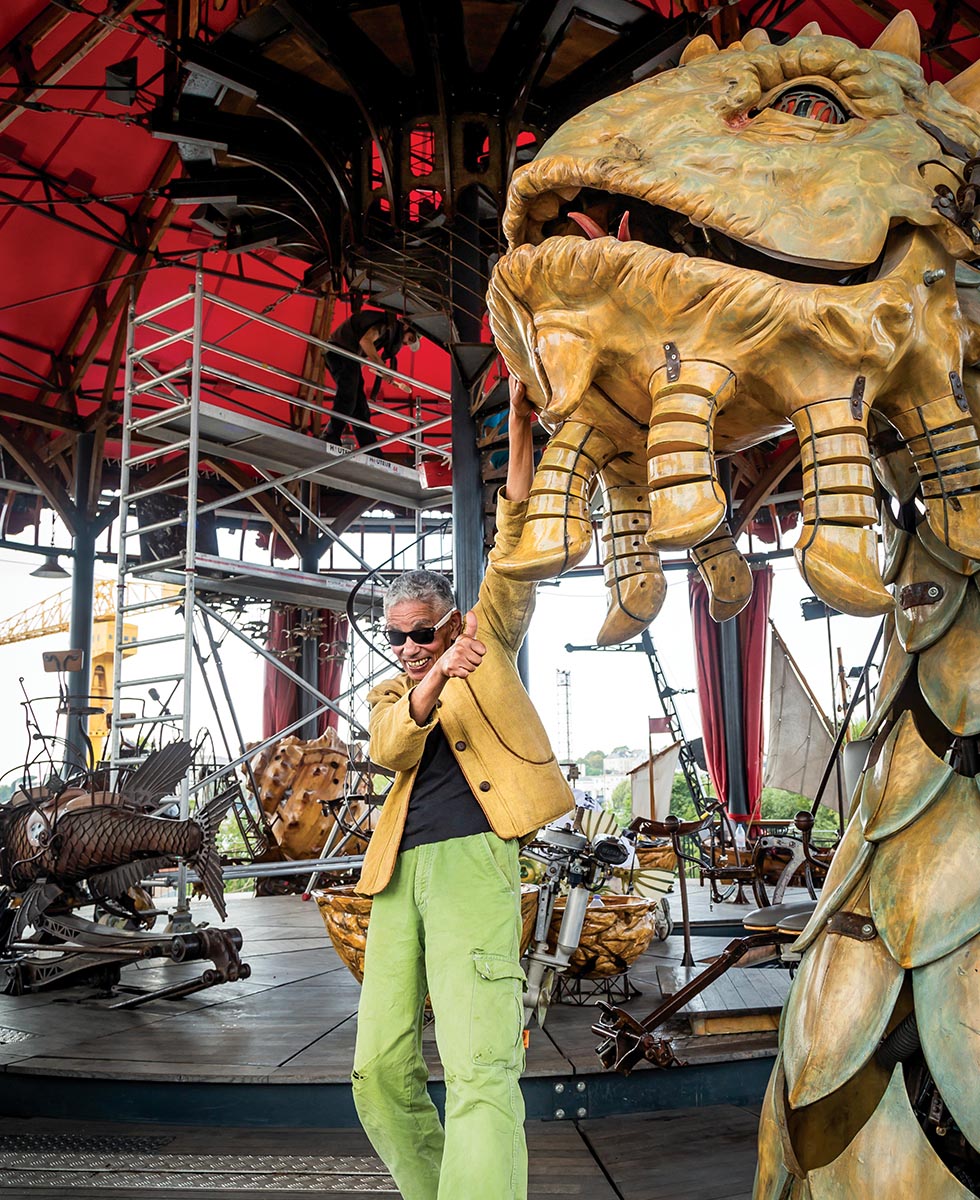 그린 라인은 당연히 일 드 낭트(Île de Nantes)를 대표하는 레 마신 드 릴(Les Machines de l’Île)도 빼놓지 않고 지난다. ‘기계의 섬’ 이라는 이름의 이 프로젝트는 낭트 출신의 공상과학 소설가 쥘 베른과 레오나르도 다 빈치가 구상한 기계를 구현하는 콘셉트. 낭트시와 공연 제작사 라 마쉰(La Machine)이 협업했다. 레 마신 드 릴의 마스코트인 기계 코끼리 그랑 엘레팡(Grand Éléphant)이 눈부신 햇살을 받으며 산책에 나선다. 육중한 발을 신중하게 내디디고, 유연하게 휘어지는 코로 물줄기를 내뿜으며. 쥘 베른의 소설 <스팀 하우스> 속 코끼리 모양의 증기기관차를 본뜬 그랑 엘레팡은 키가 8미터, 무게가 48.4톤에 달한다. 철과 목조 피부 아래에는 내장 대신 친환경 하이브리드 모터, 배터리, 실린더 62개와 더불어 50명까지 탑승 가능한 라운지를 갖췄다.