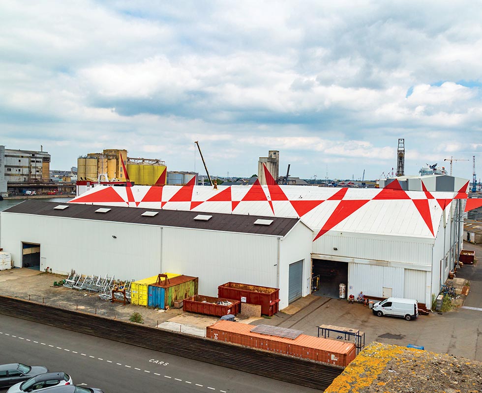에스튀아르의 마지막 작품을 보려면, 생나제르 다리를 건너 프랑스 최대 규모를 자랑하는 생나제르의 조선소 샹티에 드라틀랑티크(Chantiers de l’Atlantique)로 향해야 한다. 북극권 너머를 탐사한 프랑스 최초의 잠수함 에스파동(Espadon)이 정박된 콘크리트 요새에서 엘리베이터를 타고, 옥상의 테라스 파노라미크(Terrasse Panoramique)로 가자. 착시 효과를 활용한 작품 <쉬트 드 트리앙글 생나제르(Suite de Triangles Saint-Nazaire)>는 옥상에 표시된 특정 지점에 서야만 볼 수 있다. 그래야 사방에 펼쳐진 광활한 조선소 시설의 지붕과 벽면마다 그려진 붉은 형태가 합쳐져 여러 개의 거대한 삼각형을 이루는 것이다.