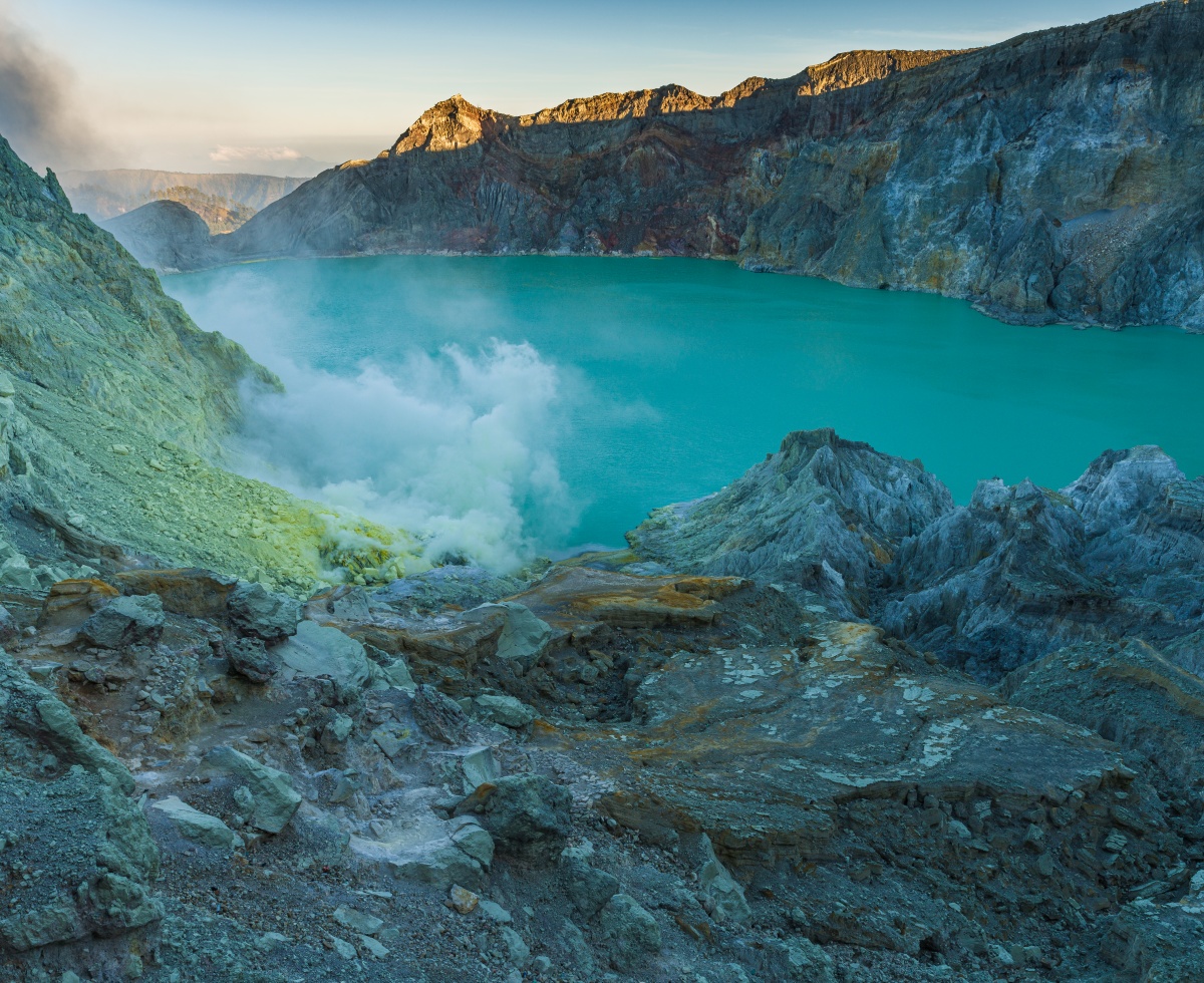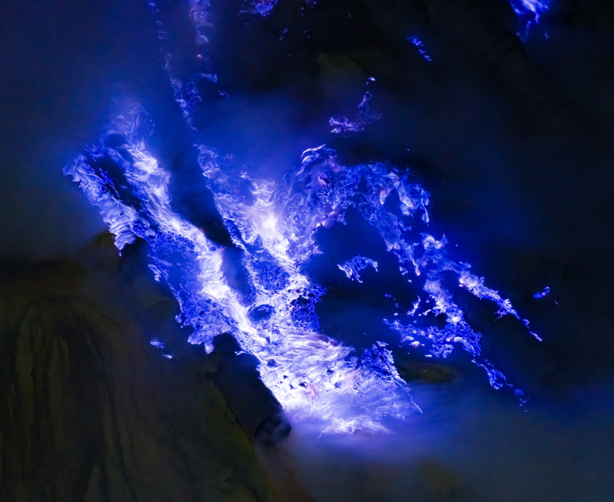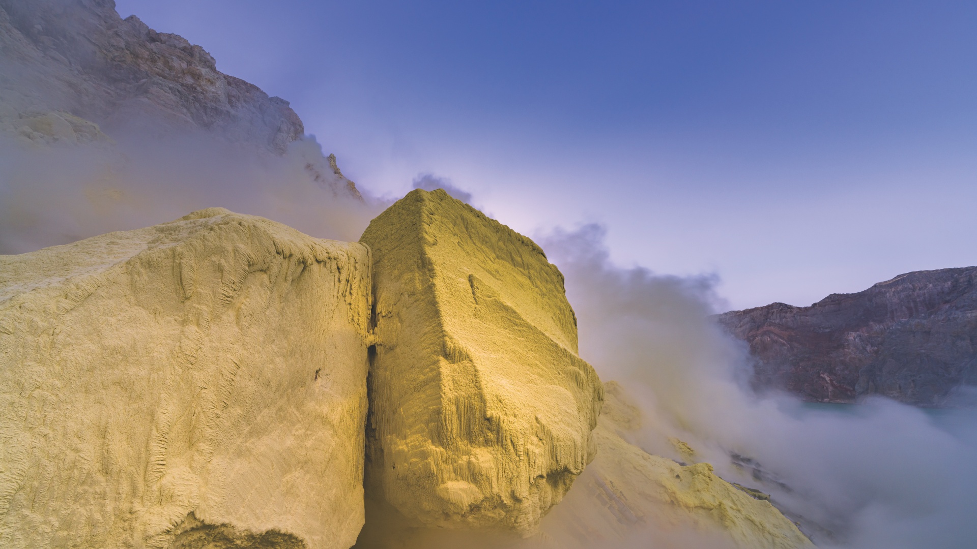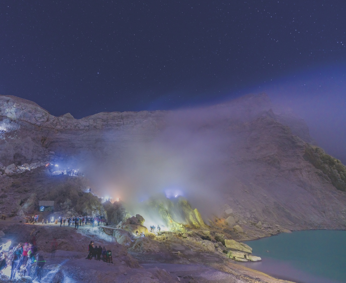 정상부에서 내려다보면 저 아래 짙은 호수가 거대한 분화구를 차지하고, 헤드 랜턴 행렬의 끝에서는 푸른 불길이 유황 가스를 내뱉으며 타오른다. 블루 파이어 주변은 인산인해다. 유황 가스가 몇 미터 앞을 제대로 못 볼 정도로 뒤덮이지만, 방독면을 착용한 여행객들은 마치 외계를 탐험하듯 이리저리 움직이며 블루 파이어를 카메라에 담는다. 가스 사이로 불길이 치솟을 때마다 사람들은 낮은 감탄사를 내뱉는다. 유황 가스로 발화돼 섭씨 600도까지 타오르는 푸른 불꽃은 ‘불타오른다’는 표현을 새롭게 규정하는 것 같다. 반면 이 혼란 속에서도 현지 광부들은 묵묵히 유황을 캐고 운반한다. 누군가에게는 일생일대의 볼거리가, 누군가에게는 힘든 작업 환경에 불과할 뿐이라는 상황이 아이러니하다. 어둠이 잦아들고, 블루 파이어를 기억에 저장한 사람들이 점차 사라질 때쯤, 이젠은 또 다른 황홀한 풍경을 꺼낸다. 서서히 핑크 빛에서 푸른빛으로 변화하는 하늘과 에머랄드빛 칼데라호, 암벽의 장막이 빛을 자르며 그린 명과 암. 이젠은 속살을 모두 드러내어 사람들을 붙잡는다. 가슴 뭉클하도록 오랫동안.