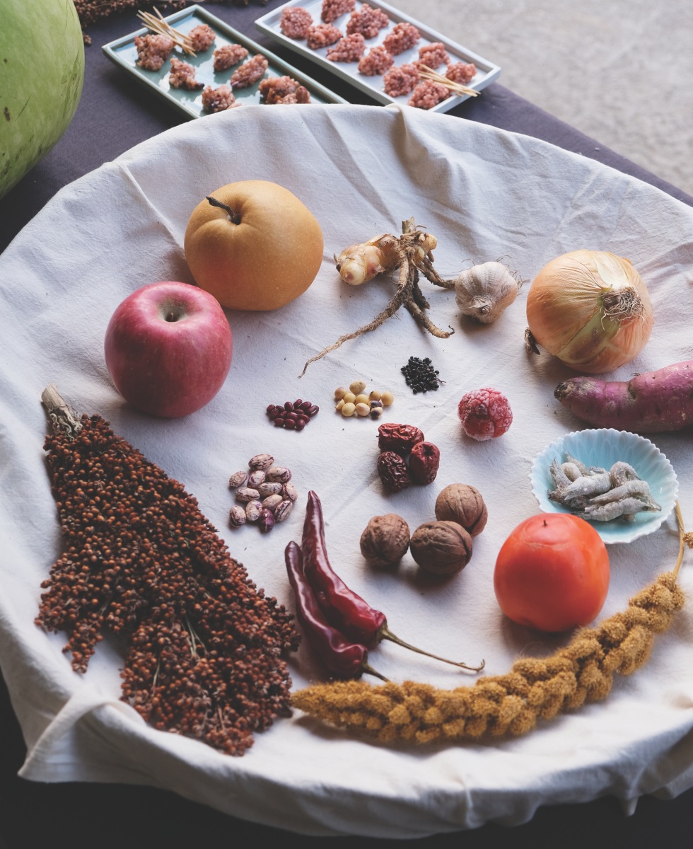 마을맛여행의 하이라이트인 수곡리 ‘외갓집 밥상’ 저녁 식사는 현(現) 주병수 이장 댁에 차려진다. 이장님의 부인, 그러니까 붉으실 마을 임종순 부녀 회장님이 여기 출신이다. 외갓집 밥상은 전식부터 모두 제천에서 난 식자재로 마을 주민이 조리해 내는 게 특징. 붉으실 마을의 대표 곡물 중 하나인 수수가 전식의 주인공이다. 호스트와 게스트가 모여 수수부꾸미를 직접 부치고, 수수막걸리를 곁들여 마신다. 찹쌀을 섞은 수수부꾸미는 찰지고 구수하며, 잔칫날에 낸다는 메수수 막걸리는 달짝지근하고 새콤하다. 부꾸미를 서너 개 집어먹고 나서야 메인 밥상의 드라마틱한 내력을 듣는다. 호랑이 양대 콩 수수밥, 시래기 새뱅이(민물새우) 국, 고들빼기 샐러드, 명주실 돼지고기 수육, 더덕 김치, 잡버섯(야생 버섯)과 박 볶음, 산초 간장. 각 메뉴마다 식자재가 어디에서 오고 집에서 어떻게 만들어 먹는지 이야기가 얽혀 있다. 그렇게 소반에 차린 건강한 한끼는 풍성하지 않을 수 없으니, 땅의 기운과 마을의 정이 오롯이 입안으로 들어간다. 오랜만에 혀를 깨우는 자연의 맛을 또 언제 먹을 수 있을지. 어느새 마당에는 모닥불이 드세게 타오르고 군고구마와 머루 와인을 담은 후식이 기다린다.