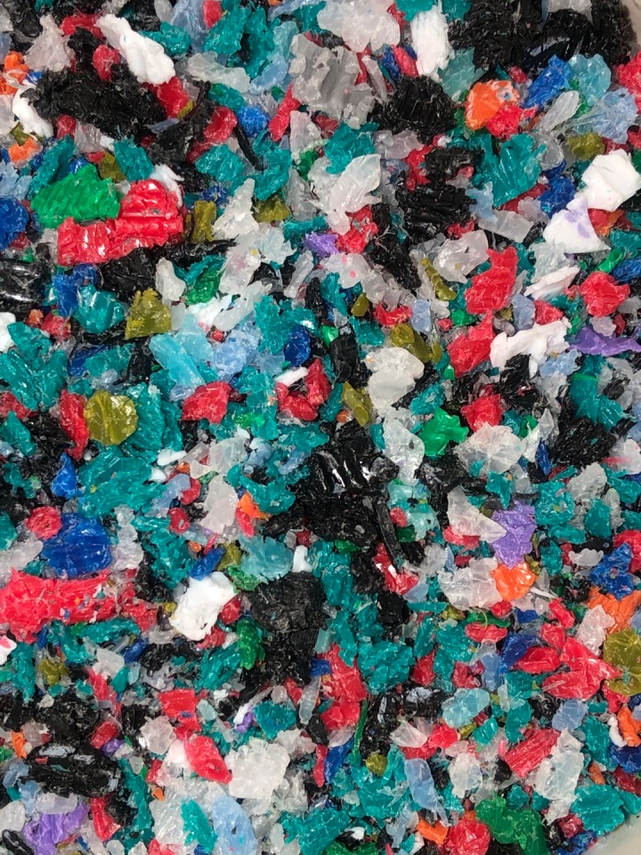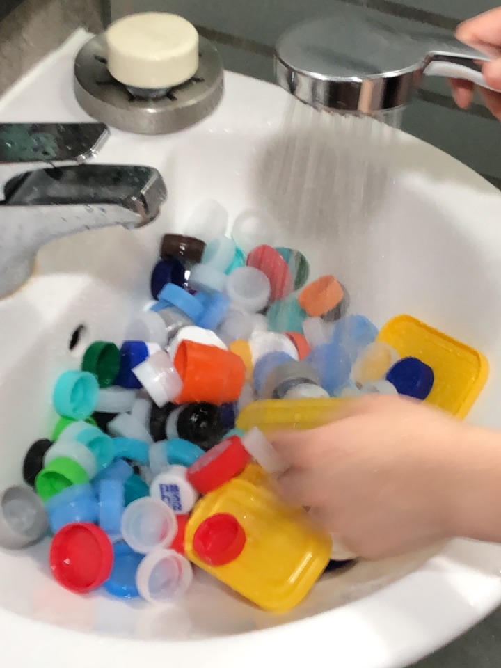 플라스틱 병뚜껑의 색을 섞어 생긴 패턴도 플베만의 감성이라고 생각해요. 원래 병뚜껑은 색깔별로 분리하지 않으면 재활용이 불가능하다고 들었어요.